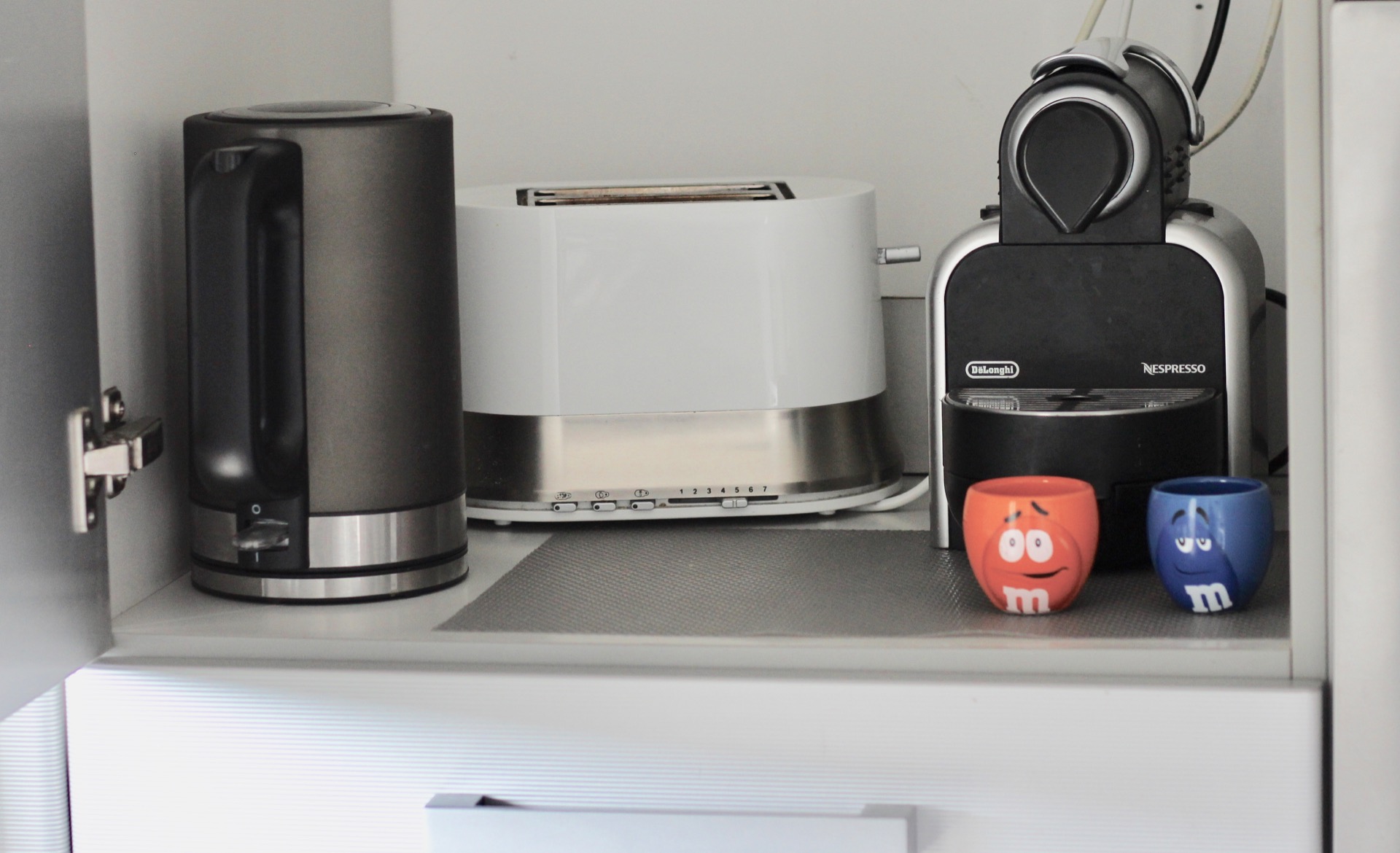 Eu tenho a máquina do café e a torradeira dentro de um armário que fica mais ou menos à altura da bancada. Como tem ali uma tomada nunca os tiro de lá, é só usar e fechar a porta.