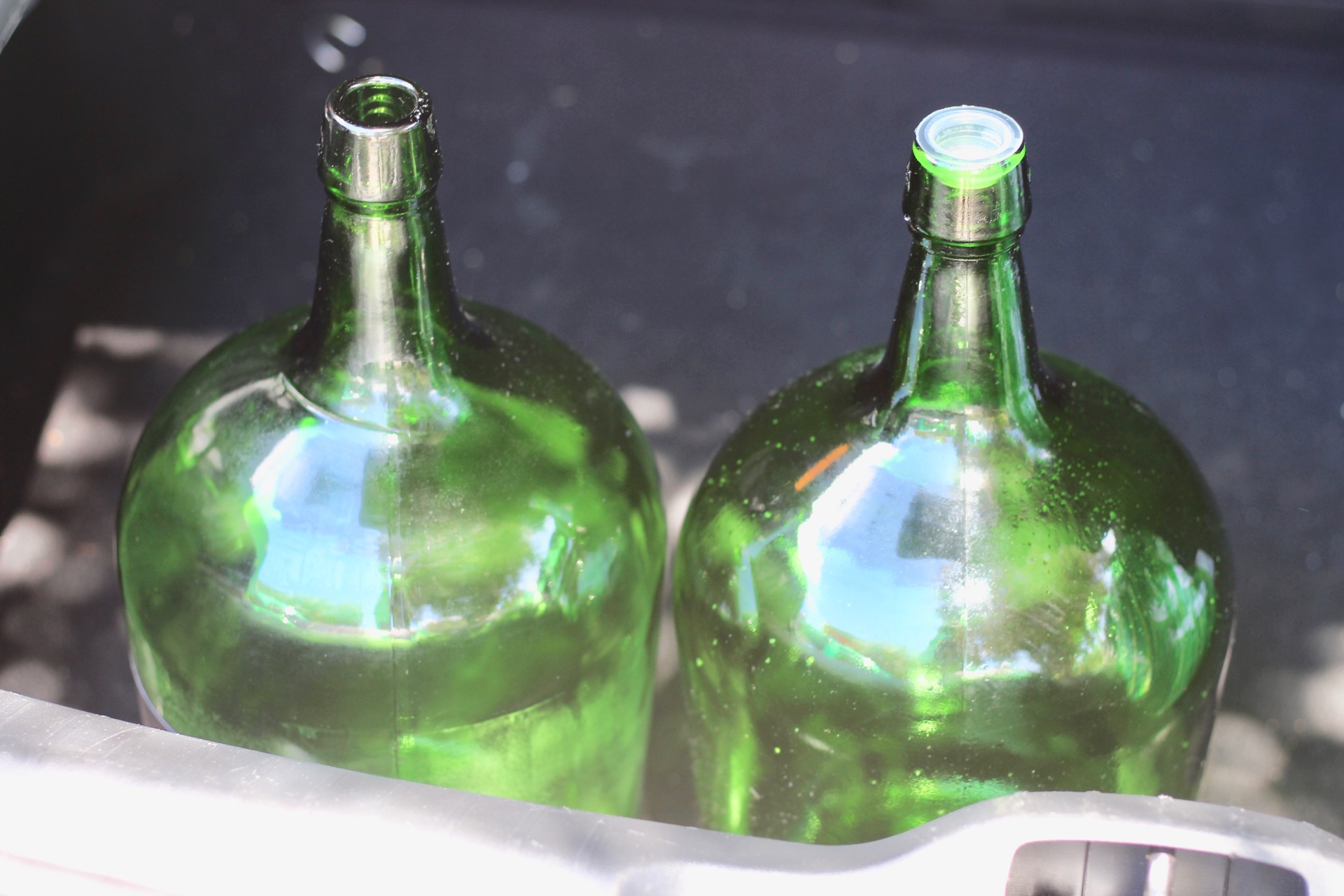 Quando vamos visitar os meus sogros levamos os garrafões de vidro que o meu sogro me deu e ajudou a recuperar. Eram antigos garrafões de vinho, que despidos do seu invólucro de plástico e bem lavados se tornaram em lindas peças que, para além de decorativas, são úteis.