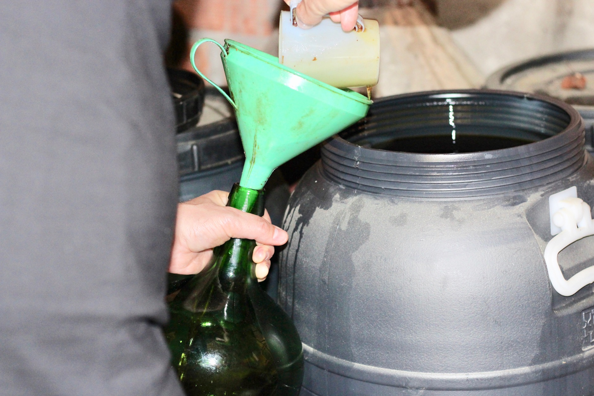 Estes garrafões são cheios com o azeite e vinagre guardados em grandes bidões e transportados de volta à nossa cozinha em Almada.